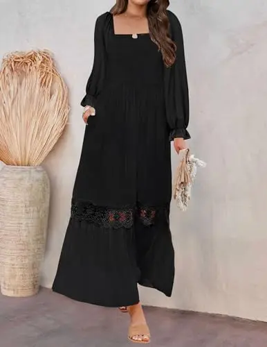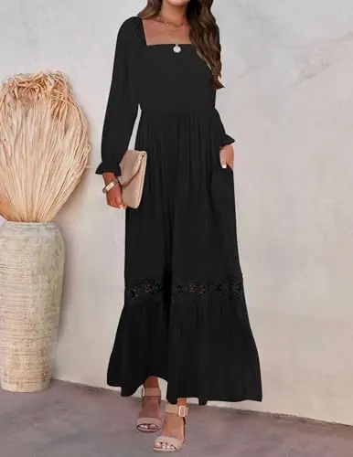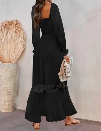 Women's Summer Casual Boho Maxi Dress Solid Long Sleeve Square Neck High Waist Flowy Chiffon Lace Trim Front Midi Length